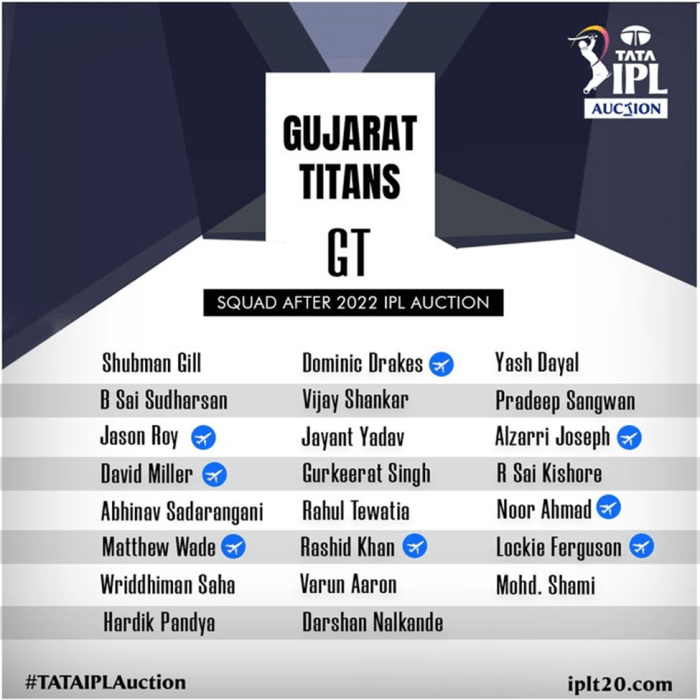 Shubman Gill, Matthew Wade (wk), Vijay Shankar, Abhinav Manohar, Hardik Pandya (c), David Miller, Rahul Tewatia, Rashid Khan, Lockie Ferguson, Varun Aaron, Mohammed Shami