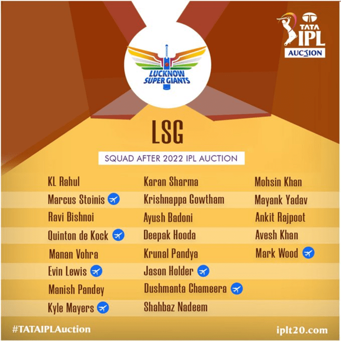 KL Rahul (c), Quinton de Kock (wk), Evin Lewis, Manish Pandey, Deepak Hooda, Krunal Pandya, Mohsin Khan, Ayush Badoni, Dushmantha Chameera, Ravi Bishnoi, Avesh Khan