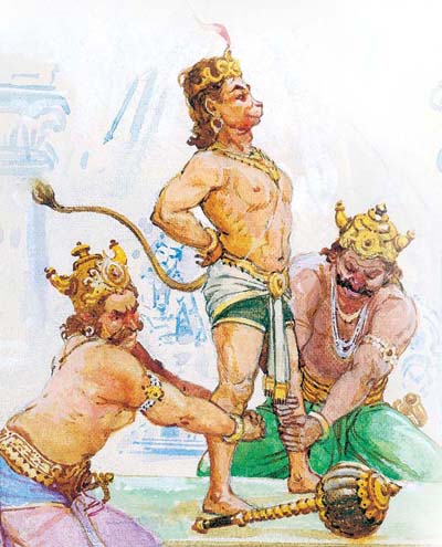 Here, Angad said to Ravan, — you know, I just smashed the ground, and you saw what happened. Supposing I had smashed your head, what could have happened?