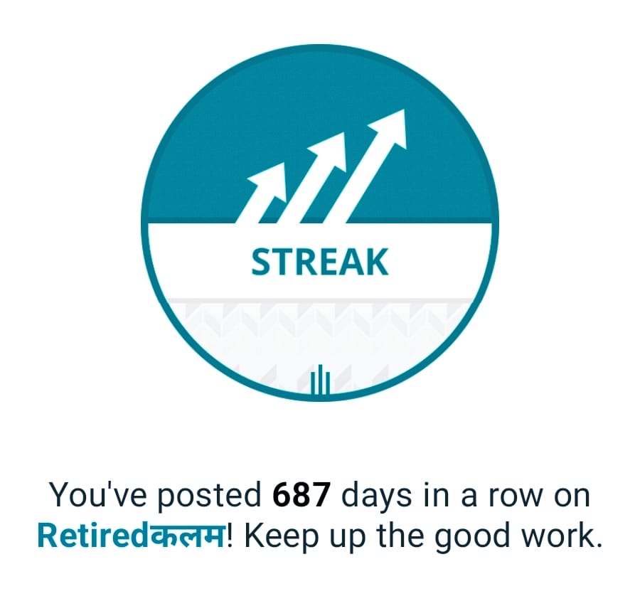- I want to be a serious writer as such I use to post blogs on daily basis without fail and my WordPress .com notified me that I have posted 688 blogs in a streak. That may be considered my better performance .. Is it not? What do you think?
