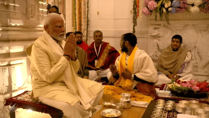 Under the sanctity of a silver umbrella, Prime Minister Modi, a symbol of reverence, entered the inner sanctum of the Rama temple. The crescendo of spiritual energy reached its zenith as PM Modi unveiled the majestic five-year-old, five-foot-high idol of Lord Rama.
