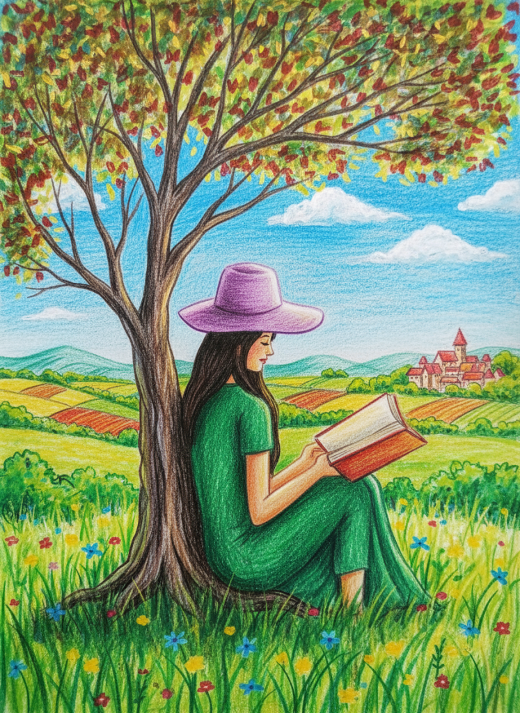 This poem shows a girl happily reading under a tree on a sunny day. Her dress and hat match the beauty around her as her imagination soars with each page.